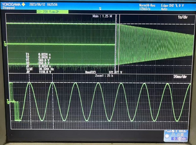 The current and voltage waveforms when the frequency inverter runs at 39.3HZ (157rpm)