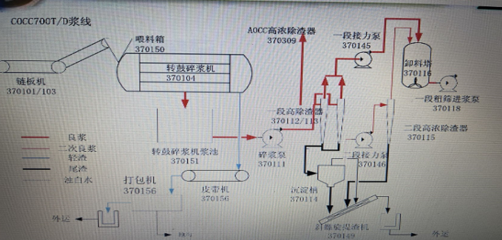客戶公司以OCC(廢舊箱板紙)為原料通過高速紙機(如上圖所示)生產低定量、高強度的瓦楞原紙。此次改造處位于高速紙機的一段粗篩進漿泵和一段除渣器進漿泵,將原有的異步電機替換成永磁同步電機來驅動進漿泵