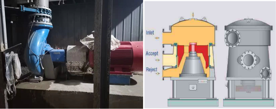 一段除渣器是利用纖維與雜質比重不同來分離雜質的。漿料以一定壓力由進料三通切線進入除渣器后高速旋轉,由于離心力的不同,重雜質被甩向器壁,在重力作用下,漸漸向錐底運行,進入沉渣罐。