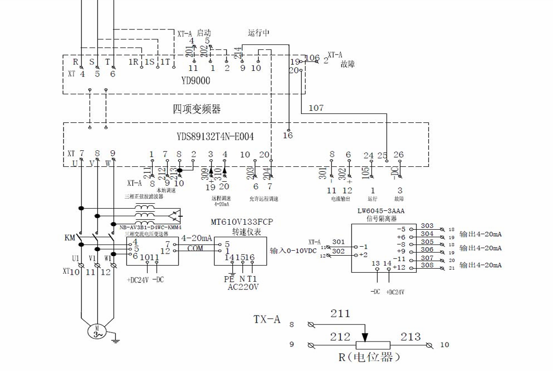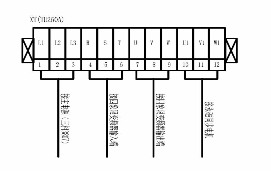 電機(jī)額定電流為194A,電機(jī)轉(zhuǎn)速750轉(zhuǎn),額定扭矩1680NM, 額定功率132KW。配電房和水塔電機(jī)之間的線纜超過150m。 根據(jù)電機(jī)的型號(hào),我司選擇了額定電流250A的132KW四象 限變頻器。 為了減少輸出電纜上和電機(jī)中的脈沖電流,延長(zhǎng)電機(jī)壽 命,在變頻器與電機(jī)之間使用更長(zhǎng)的電纜連線,所以我 司選擇在變頻器和電機(jī)之間加裝正弦波濾波器。