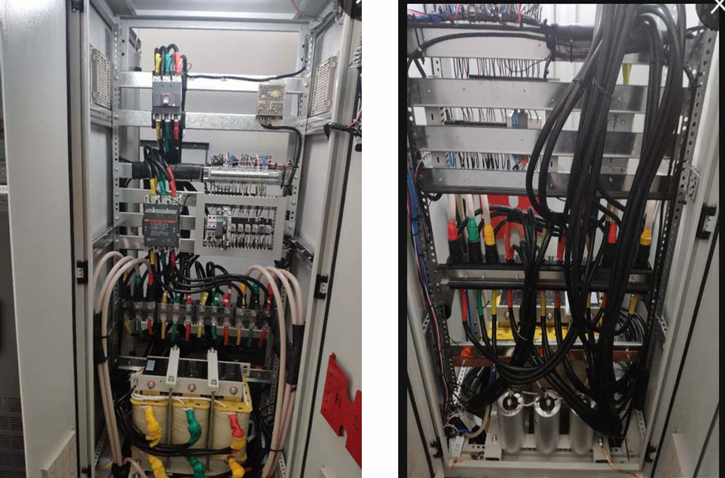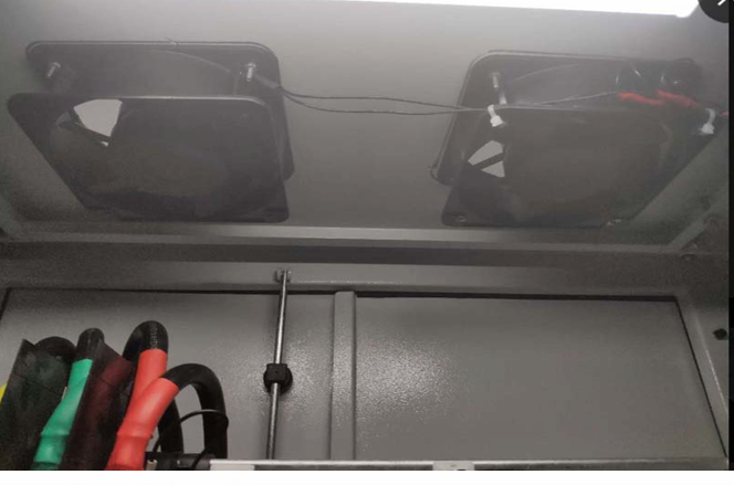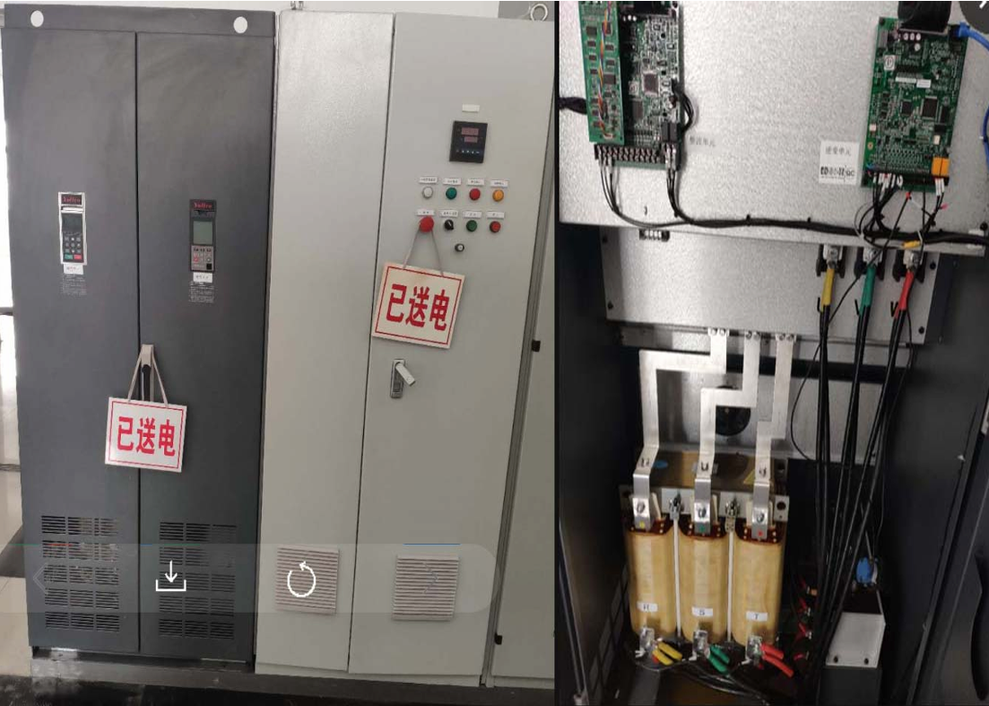 發(fā)電過程中變頻器有效功率為負(fù)值,濾波器線圈部 分流過電流大,發(fā)熱量大,因現(xiàn)場(chǎng)并柜無法在左右 兩側(cè)加裝對(duì)流風(fēng)扇,只能在柜頂加裝風(fēng)扇散熱。 柜內(nèi)溫度30度左右,線圈部分70度左右屬于正常情況。