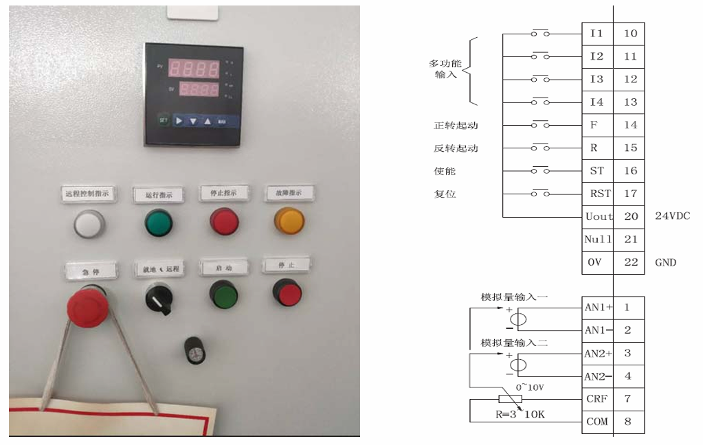 模擬量輸入1通道接本地電位器,模擬量輸入2通道接遠(yuǎn)程4-20mA。 通過端子I1和公共端閉合來實(shí)現(xiàn)通道1和通道2的切換。