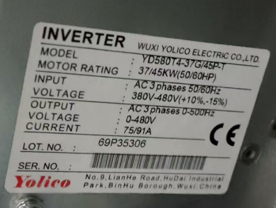 電機45KW,額定電流91A,額定轉(zhuǎn)速1480rpm,根據(jù)電機的型號,我司選擇了額定電流91A的型號為YD580T4-37G/45P-T變頻器