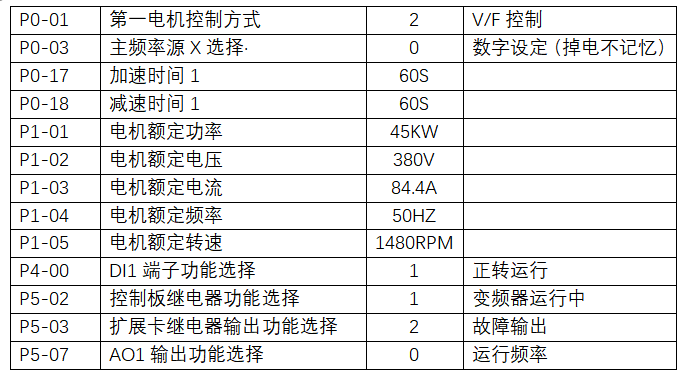 變頻器和電機之間存在一定距離,變頻器和電機都要做好接地的準備。現(xiàn)場變頻器帶45KW電機,DI1給定端子啟動,AO1頻率輸出,一組繼電器TA1/TC1反饋運行信號,另一組TA2/TC2反饋報警信號。RST接電源,UVW接電機